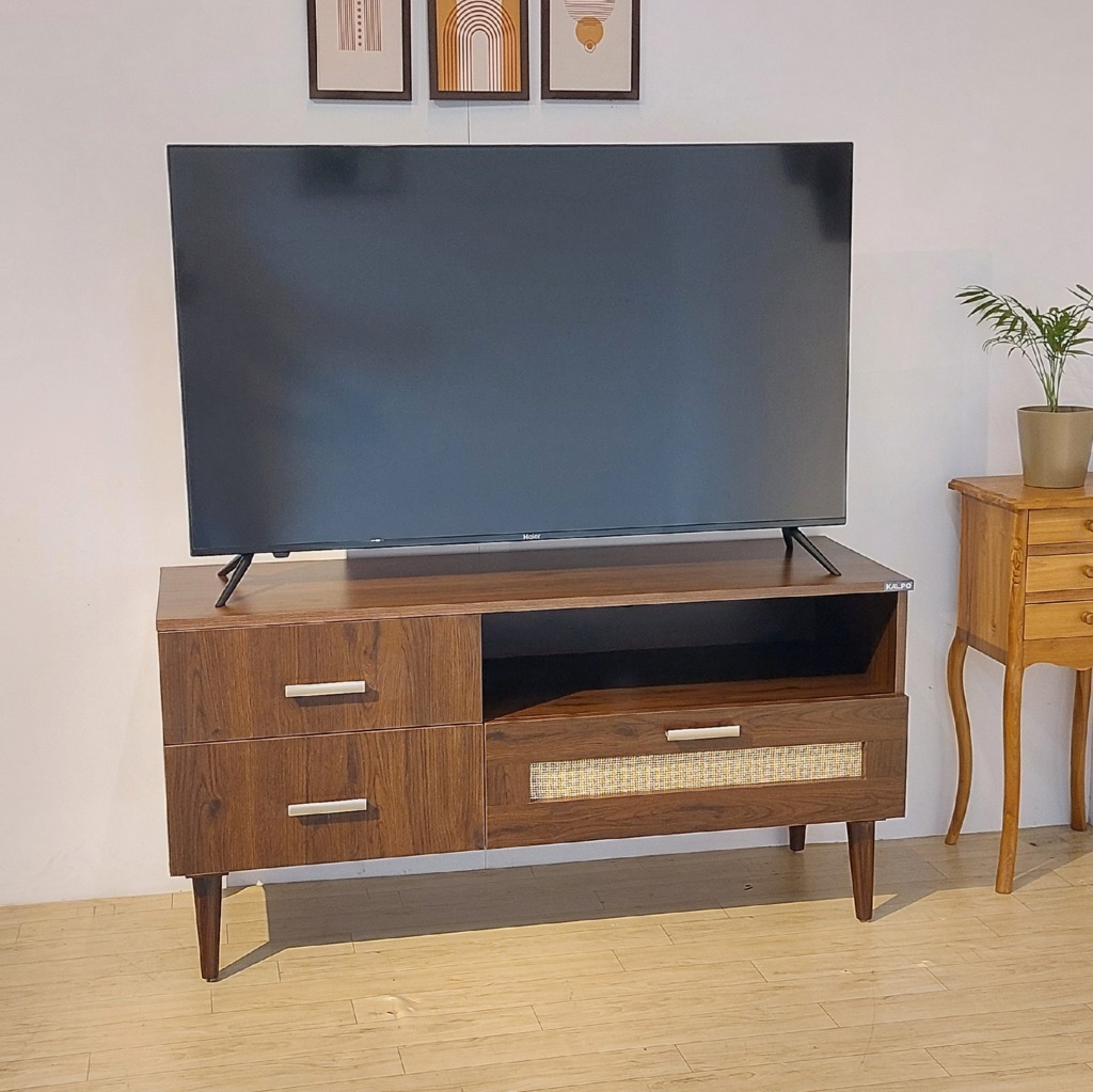 Elite Rattan TV unit is a modern TV unit featuring a sleek and minimalist design. Made from a warm wooden finish, it combines functionality with aesthetic appeal. The unit includes two spacious drawers on the left for concealed storage and an open shelf on the right for media devices, complete with a cable management hole for easy organization. The lower drawer features a stylish rattan panel, adding a touch of natural texture. Supported by angled, tapered legs, the unit has a mid-century modern vibe that complements a variety of home decor styles.