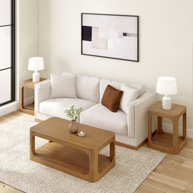 Velar contemporary coffee table features a sleek wooden design with smooth rounded edges, offering both style and functionality. Its minimalist silhouette is complemented by a spacious lower shelf, perfect for additional storage or display items like books and decor. Crafted from durable materials, the warm natural finish enhances its versatility, making it an ideal centerpiece for modern and cozy living spaces.