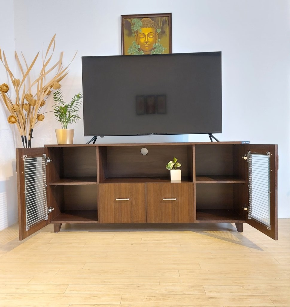 Enhance your living space with this sleek wooden TV unit, featuring a rich walnut finish and frosted glass panel doors for a touch of sophistication. Designed for both style and functionality, it offers open shelving for media devices or decor, two spacious drawers for hidden storage, and a built-in cable management cutout to keep cords organized and clutter-free. Crafted for durability, this unit accommodates TVs up to 55 inches, making it a perfect addition to modern homes while ensuring ample storage and a clean, elegant look.