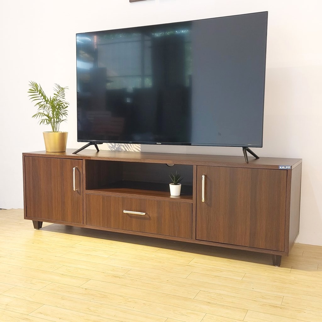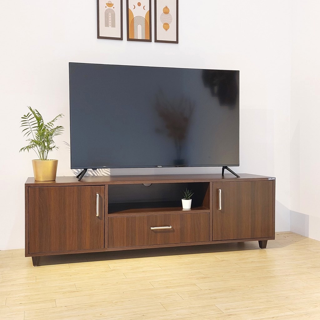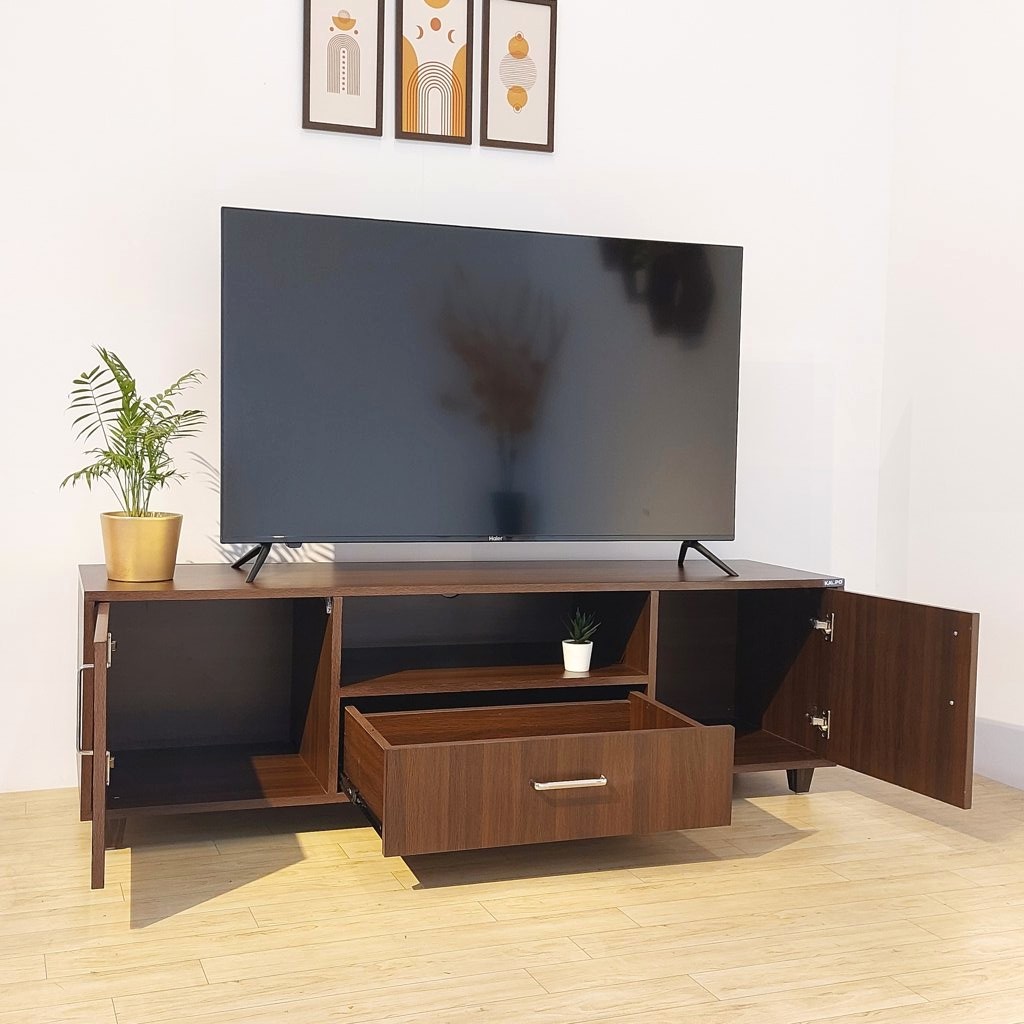 Vouge TV unit features a sleek and contemporary design with a rich wooden finish, perfect for modern living spaces. It offers a balanced combination of storage and display options, including two side cabinets for concealed storage, a central drawer for organized items, and an open shelf for media devices or decor accents. The unit is complemented by elegant metal handles and sturdy legs, ensuring both functionality and style. Its simple yet sophisticated design makes it a versatile addition to various interior themes.