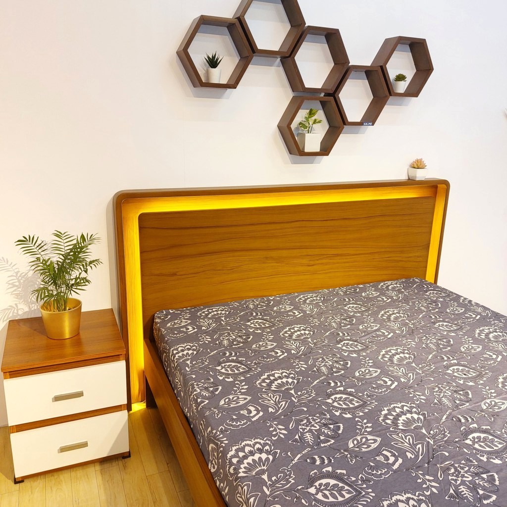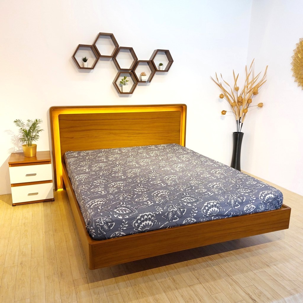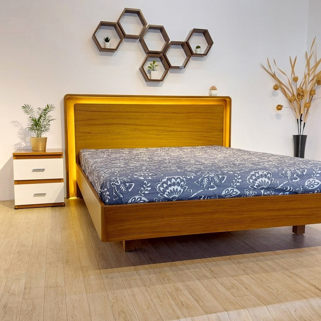 Transform your bedroom with this elegant, minimalist bed frame that blends modern aesthetics with timeless appeal. Crafted from wood with a natural teak finish, this bed features a sleek floating design, creating a spacious and airy look. The gently curved headboard adds a touch of sophistication and comfort, while its smooth edges and warm finish enhance the overall style. Paired with matching side tables for added functionality, this bed is perfect for modern and contemporary interiors. Durable, stylish, and easy to maintain, it is an ideal choice for those seeking a combination of beauty and practicality.
